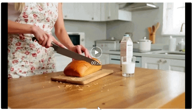 1、厨房明亮通风,白色橱柜和木质台面交相辉映。一块新鲜出炉的面包放在砧板上,旁边放着一个玻璃杯和一盒牛奶。一位身着碎花围裙的女士站在木质台面旁,熟练地用锋利的刀切着一块金黄色的面包。面包放在砧板上,她切的时候,面包屑四处飞溅。