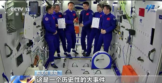 航天员 张陆:当时第一次神舟十五任务的时候,我们和神舟十四号第一次“太空会师”,这是一个历史性的大事件,那在这一次“太空会师”之中,然后我们双方也都有一些展示给大家的东西,就比如当时准备的衣服,前面是写的星空浩瀚无比,背面写的是探索永无止境。