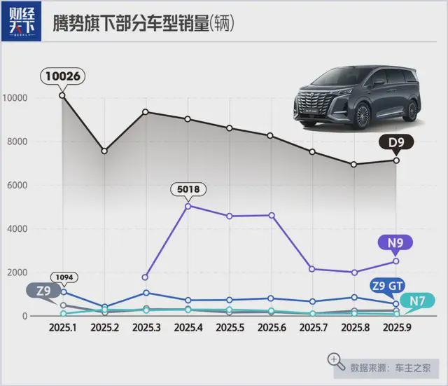 拳头产品腾势D9,前9个月的销量为74906辆,虽仍位居MPV细分市场第一,但与2024年同期相比,销量同比下滑约5.57%。今年前9个月,腾势汽车累计销售115605辆,同比增长28.2%。与年初定下的30万辆销售目标,还有一定距离。
