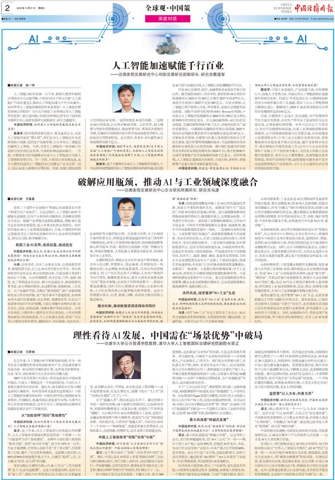 人工智能(AI)的发展一日千里,新的大模型和新的应用场景令人应接不暇,中国发布《关于深入实施“人工智能+”行动的意见》,推动人工智能加速与千行百业融合。如何看待人工智能发展现状和未来前景?人工智能在哪些领域应用较好?为什么中国在工业领域应用人工智能具有优势?就上述问题,中国经济时报记者专访了国务院发展研究中心创新发展研究部副部长、研究员戴建军。