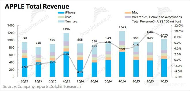 1.1 收入端:2025 财年第四季度(即 3Q25)苹果公司实现营收 1025 亿美元,同比增长 7.9%,符合市场一致预期(1020 亿美元)。公司本季度收入端的提升,主要受益于 iPhone、Mac 和软件服务业务增长的带动,而 iPad 和可穿戴等其他硬件业务表现仍相对较弱。