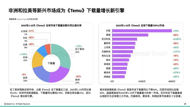 非洲和拉美等新兴市场正成为《Temu》全球增长的新引擎。拉丁美洲领跑全球,占《Temu》总下载量近三成;非洲市场高速崛起,下载量暴涨178%,带来可观新增用户。巴西逆势飙升79%,登顶最大单一市场;尼日利亚激增83倍跃居全球第三,彰显品牌在新兴市场的强大吸引力和增长潜力。