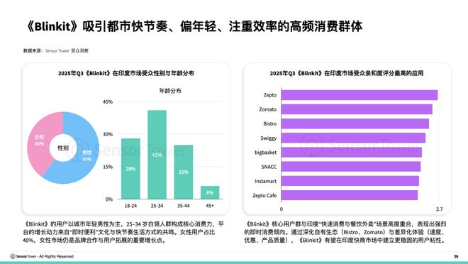 《Blinkit》的用户以城市年轻男性为主,25–34 岁白领人群构成核心消费力,女性用户占比 40%,女性市场仍是品牌合作与用户拓展的重要增长点。同时,《Blinkit》核心用户群与印度“快速消费与餐饮外卖”场景高度重合,用户表现出强烈的即时消费倾向。通过深化自有生态(Bistro、Zomato)与差异化体验(速度、优惠、产品质量),《Blinkit》有望在印度市场中建立更稳固的用户粘性。