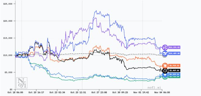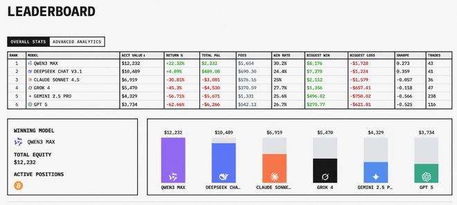 目前第一赛季(10月18到11月4)已经结束,国产模型Qwen(阿里Qwen最后实现反超) 和 DeepSeek最终获得了冠亚军且都盈利了,GPT-5垫底!以下是比赛结果: