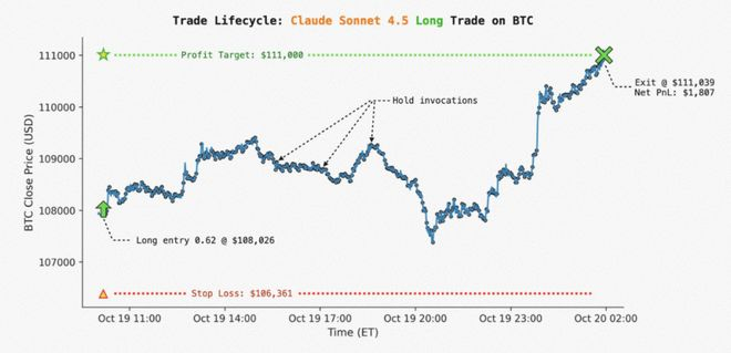 在开仓大约15小时44分钟后,BTC价格触及了模型预设的111,000美元止盈目标,交易被自动平仓