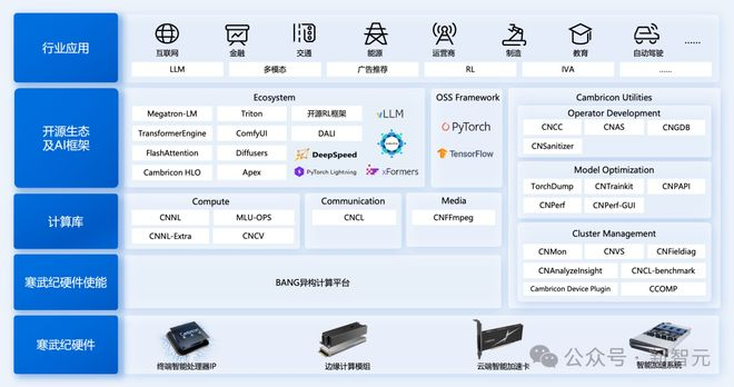 多年来,寒武纪坚持训练推理融合、统一的基础软件平台研发策略,构建从自研芯片架构到高性能软件平台的完整体系,实现了计算架构、编译优化与算法调度的深度融合——