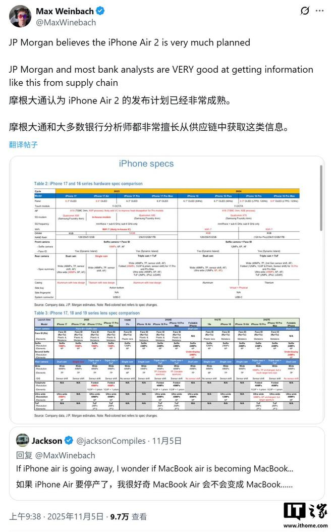 IT之家 11 月 6 日消息,科技媒体 Wccftech 昨日(11 月 5 日)发布博文,报道称华尔街投行摩根大通在最新投资报告中,预测了截至 2027 年的苹果产品规划,明确将 iPhone Air 2 和 iPhone Air 3 列入了发布规划。