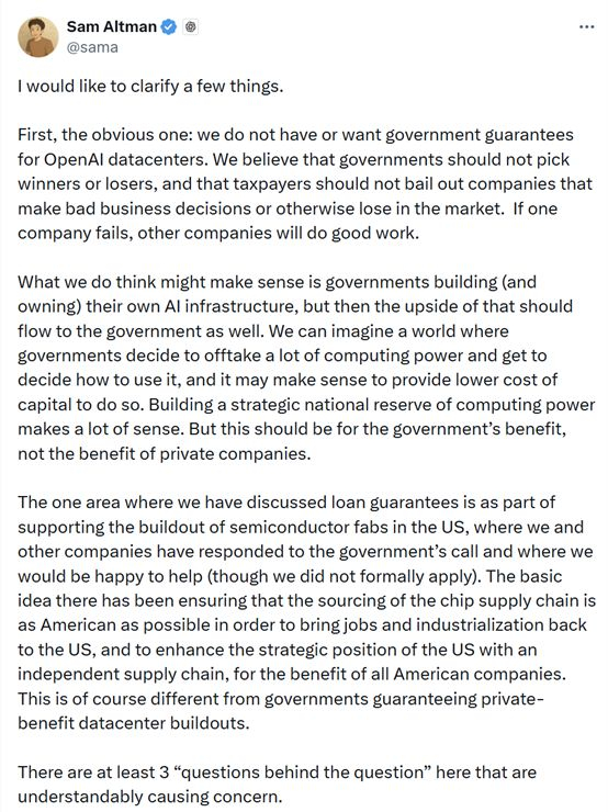 他还进一步解释称,公司 CFO 的意思是美国政府应当建立 “国家战略算力储备”,大量签订算力采购协议,且这应该服务公共利益,而不是帮助某家私营公司获利。