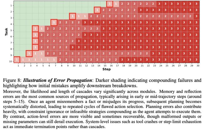 在他们绘制的错误传播热力图中,几乎所有失败都表现出「层层扩散」的特征。早期一个看似微不足道的反思失误,往往会沿着记忆、规划、行动的路径逐步放大。一旦进入后期,错误几乎不可逆转。