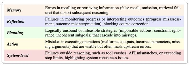 它把智能体的决策过程拆解为五个核心模块:记忆、反思、规划、行动与系统。相应地,所有错误也被映射到这五个层面。