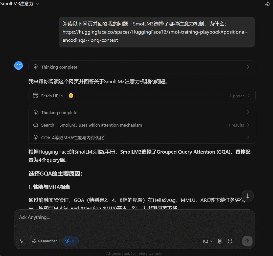 可以看到,Kimi K2 Thinking 不仅在长文中精准地找到了答案,还依据博客内容,清晰阐述了选择该机制的原因。