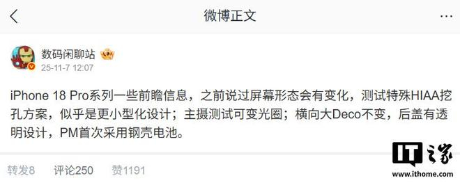 IT之家 11 月 7 日消息,微博博主 @数码闲聊站 今日分享了他所了解的苹果 iPhone 18 Pro 系列工程机开发最新进展。