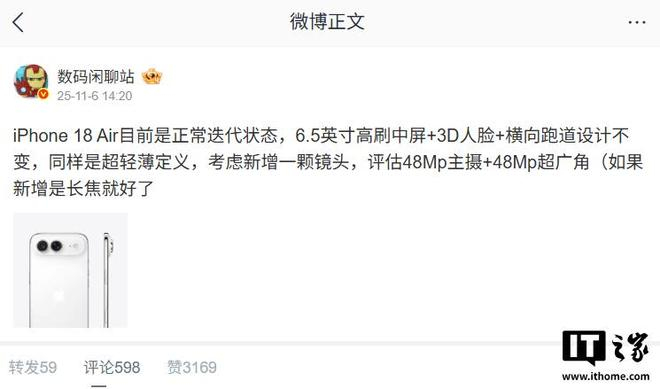 @数码闲聊站 还提到,明年的 iPhone 18 Air 目前是正常迭代状态,工程机采用了 6.5 英寸高刷中屏 + 3D 人脸 + 横向 Deco 设计,同样是超轻薄定义,正考虑新增一颗 48Mp 主摄或 48Mp 超广角镜头。