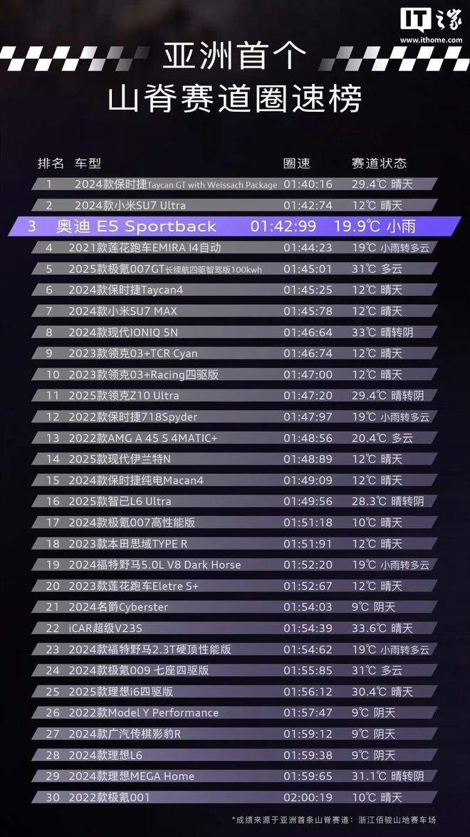 IT之家 11 月 10 日消息,上汽奥迪今日宣布,奥迪 E5 Sportback 汽车以 01'42''99 的成绩刷新了五十万内山脊赛道圈速纪录,在亚洲首个山脊赛道圈速榜上排名第 3。而在其上的车型为 2024 款保时捷 Taycan GT with Weissach Package、2024 款小米 SU7 Ultra。具体排名如下: