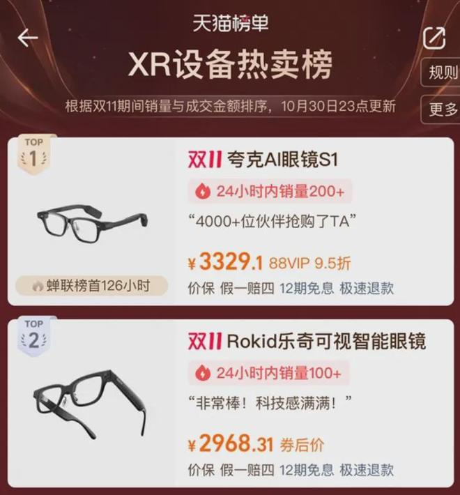 作为专注智能眼镜赛道的品牌,Rokid 在今年双11期间精准锚定“办公轻量化”与 “户外场景便携”需求,推出支持面对面翻译、提词等场景的新款可视智能眼镜。借助天猫趋势品类流量扶持,同比成交增长超7倍,成功跻身XR设备双11热卖榜前2名。