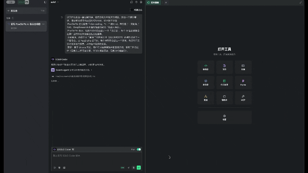 在 SOLO Coder 中,这一步可以让「 Plan 」来执行:它会在真正开始写代码之前,先生成一份结构清晰的任务规划,让人和模型对「要做什么」以及「打算怎么做」先达成共识,从而减少误解、提升可控性和工程质量。