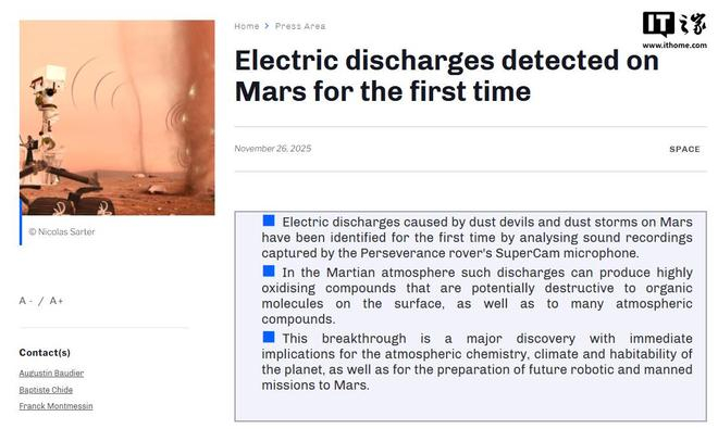 IT之家 11 月 27 日消息,法国国家科学研究中心 11 月 26 日宣布,该机构参与的一个国际团队首次确认了火星上存在由火星尘暴引起的放电现象。该发现具有重大意义,将直接影响人类对火星大气化学、气候特征、宜居性的认知,同时为未来无人探测与载人任务提供关键参考。相关研究成果于 2025 年 11 月 26 日发表在《自然》(Nature)期刊。