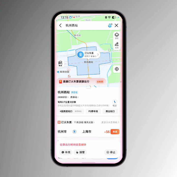 在搞清楚了动车信息之后,它就会打开地图软件,查询从我这去车站需要多久。