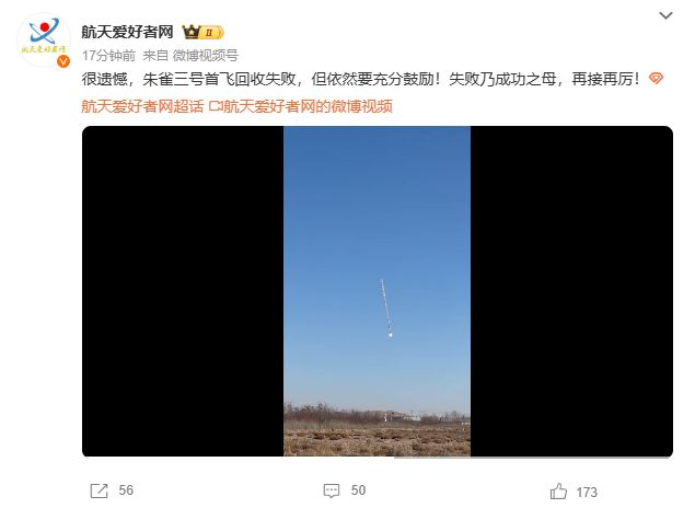 失败乃成功之母,再接再厉!朱雀三号首飞回收失败