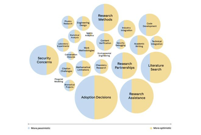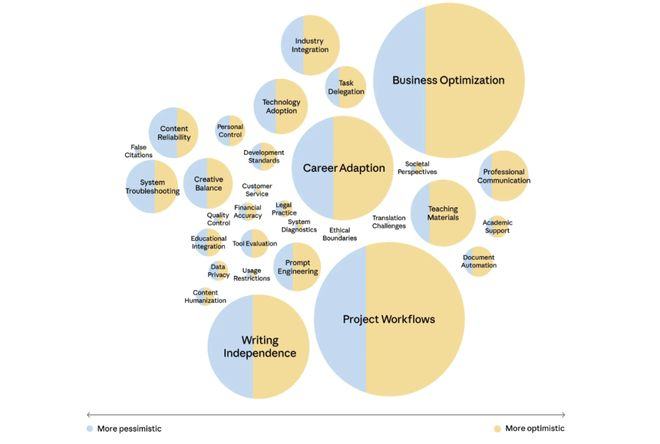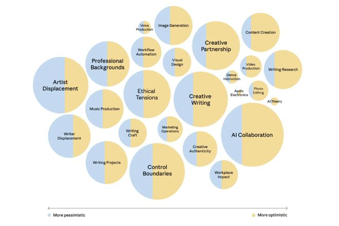 普遍乐观,局部悲观:在受访样本中,人们对AI在工作中的作用持乐观态度。但少数话题,如教育融合、艺术家替代和安全问题,则带有更多悲观情绪