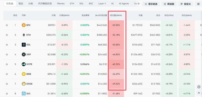 12月7日上午,比特币一度向下跌破89000美元,而在6日晚它曾向上触及9万美元。截至发稿,加密货币市场涨跌互现,主要品种成交额全线大幅下跌,近24小时内,比特币、以太坊、SOL等主要品种成交额均腰斩,跌超50%。