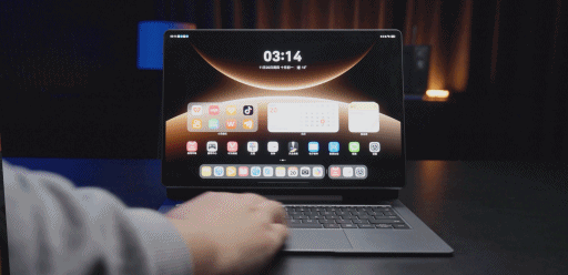 然后两者一结合的时候,它就能够通过磁吸给吸住,这个时候你就获得了一个长相神似 iPad + 妙控键盘的设备。