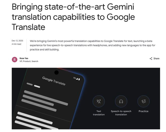 财联社12月13日讯(编辑 史正丞)科技巨头谷歌公司周五发布公告称,正式将最先进的Gemini翻译能力引入翻译应用,包括通过佩戴耳机实现的“AI同传/交传”,同时大幅提升文字翻译工具的能力,以提供更自然、地道的翻译,而不是逐字逐句直译。