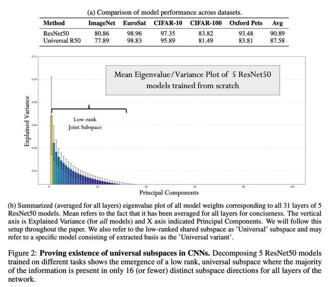 即便如此,对 ResNet-50 所有层的平均解释方差(图 2b)分析揭示了一个跨越这些不相交任务的独特共享低秩结构:大部分信息仅存在于 16 个(或更少)不同的子空间方向中。此外,将模型投影到这一子空间以获得低秩 ResNet-50(从而减少参数)后,其性能相对于完全微调仍具竞争力,进一步支持了联合子空间的存在和实用性(图 2a)。