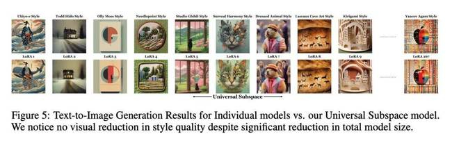 接下来,作者进一步将分析扩展到使用 Stable Diffusion-XL 的文生图任务。从 HuggingFace 上公开可用的 LoRA 中提取通用子空间后,将单个 LoRA 投影到该子空间,生成的图像保持了视觉质量和风格(图 5)。