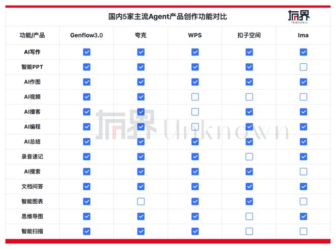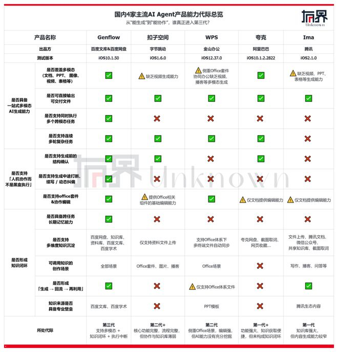 带着这些问题,我们挑选了目前国内5家主流大厂系Agent进行实测:百度GenFlow3.0、腾讯ima、金山WPS.AI、扣子空间、夸克。而通过5款产品测评后,我们发现3次代际分层正在出现: