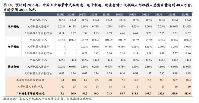基于此,国泰海通证券对市场空间做出了量化预测:“预计到2035年,中国工业场景中汽车制造、电子制造、物流仓储三大领域人形机器人总需求量达到48.4万台,市场空间483.6亿元”。这一预测为投资者描绘了巨大的增长潜力。