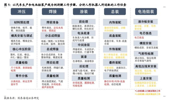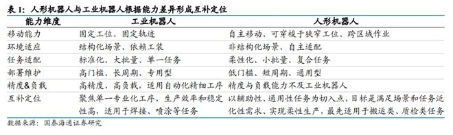 国泰海通证券的报告明确指出,“人形机器人并非要取代工业机器人,目标是取代人工工位”。二者将形成互补定位:工业机器人继续专注于固定工位的高速、高负载、精准重复作业,而人形机器人则发挥其灵活性和移动优势。
