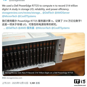 IT之家 12 月 26 日消息,科技媒体 Tom's Hardware 今天(12 月 26 日)发布博文,报道称 StorageReview 近日宣布打破圆周率(Pi)计算世界纪录,将计算精度提升至小数点后 314 万亿位。