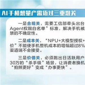 李锦堤认为,新一代AI手机的发展是趋势,但想量产,需要迈过三重难关:一是合规关,需要工信部牵头出台“终端Agent权限白名单”标准,解决手机被App封禁的不确定性;二是成本关,“NPU+大模型授权+内存溢价”不能使手机整机成本的增幅超过8%,否则渠道端不会接受;三是价值关,必须跑出日活跃用户数大于30万的“杀手级”场景,让消费者换机理由从“拍照更好”变成“办事更快”。这三关一过,AI手机才会从“Demo”变成“现金流”。