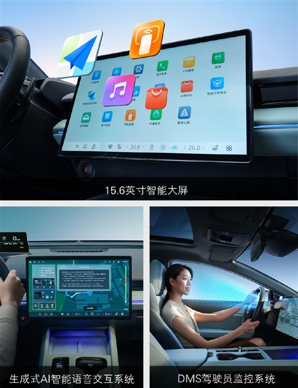 车内变动最大之处在于,此前的纵向中控屏换装为15.6英寸的横向屏幕,更顺应市场主流APP布局以及审美需求。车机介入AI语音大模型,语音交互能力大幅提升。