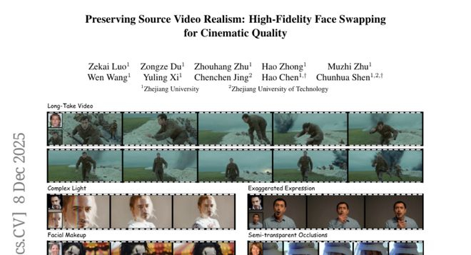 这项由浙江大学罗泽楷、杜宗泽、朱舟航等研究团队完成的重要研究发表于2025年12月,论文编号为arXiv:2512.07951v1,标志着视频换脸技术在电影制作领域的重大突破。对于完全不了解AI技术的普通人来说,这项研究的意义就像是从黑白电视跳跃到高清彩电一样重要。