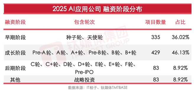 进一步透视所有AI应用类项目的融资轮次,我们发现有36%的公司处于早期阶段(种子、天使轮),有46%的公司处于成长期阶段(A-B轮),两者之和占公司总数的82%,而处于后期与战略投资阶段的公司整体占比不到18%。