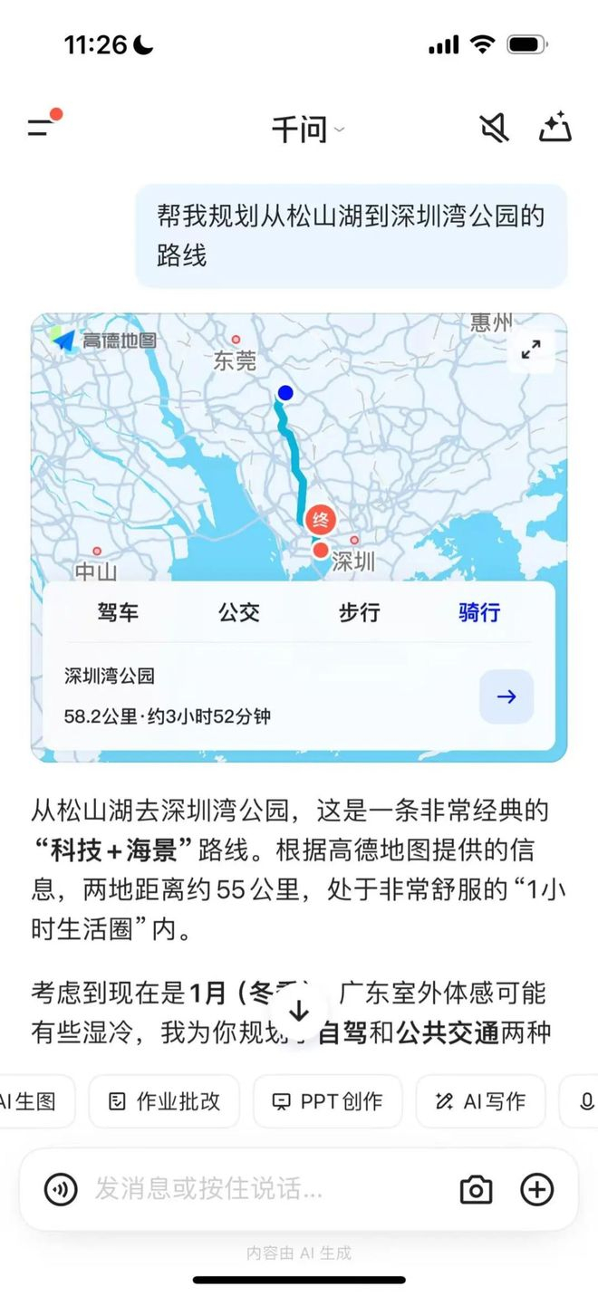 这种“中央调度、地方响应”的架构,实际上是想撬动阿里整个生态。12月18日,千问APP已正式接入高德地图,利用高德的实时交通数据和超2亿POI数据库,实现地理空间理解与可视化决策卡片服务,用户可一键导航或打车。