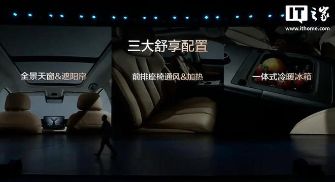 这款新车带来了星河米、翠峰绿等车色,配备前排座椅通风 / 加热、一体式冷暖冰箱、全景天窗及遮阳帘等三大舒享配置,提供 15.6 英寸超大中控屏。