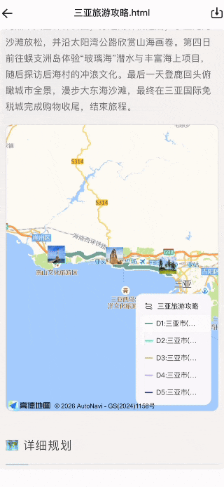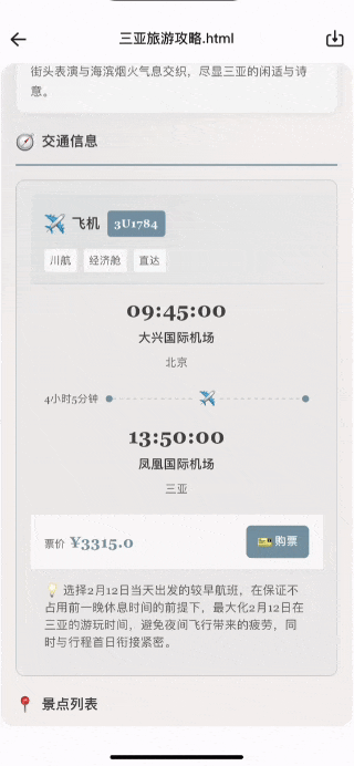 没过一会儿,千问就给我甩出了一份超详细、图文并茂、还带交互功能的旅游攻略。(震惊.jpg)