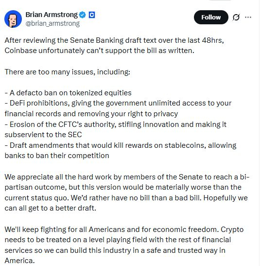 就在参议院银行委员会定于周四上午对法案进行审议前夜,美国最大加密货币交易所Coinbase首席执行官Brian Armstrong突然在社交媒体上宣布撤回对该法案的支持。Armstrong表示,“我们宁愿没有法案,也不要一个糟糕的法案”,并列举了包括限制稳定币奖励、代币化股票和去中心化金融等多项关键问题。