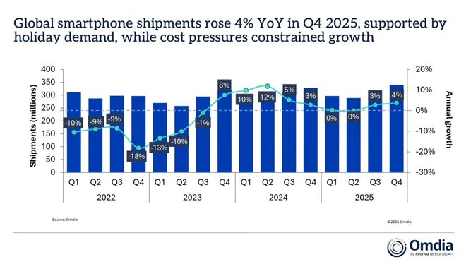 Omdia 报告:2025Q4 全球手机出货量出炉,苹果、三星、小米稳居前三