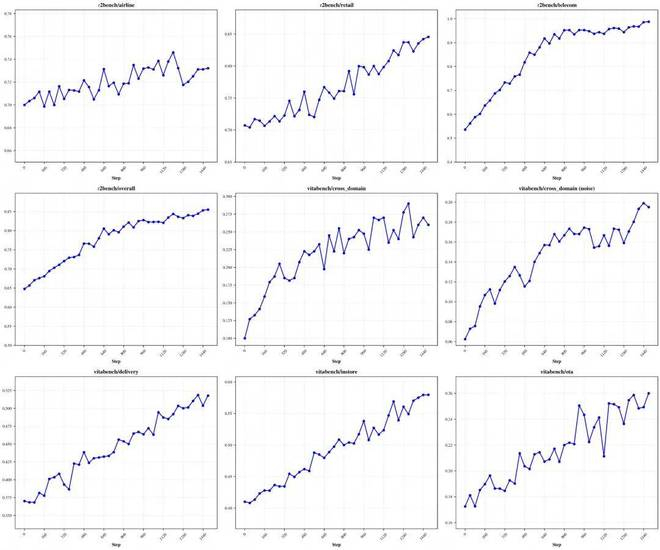 LongCat 团队还构建了配套数据库以确保任务的可执行性,并验证每个任务至少存在一种可执行解。然而,当环境中包含大量工具时,跨数据库的一致性维护会变得困难,可能导致部分任务无法验证。针对这一问题,LongCat 团队设计了专门的应对策略,使训练的稳定性和有效性得到了充分保障。