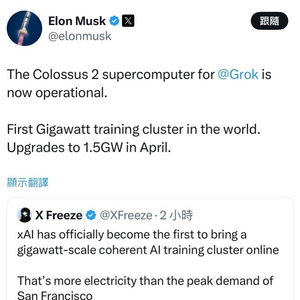 IT之家 1 月 17 日消息,埃隆 · 马斯克(Elon Musk)今日在社交平台上透露,用于 Grok 的“Colossus 2”超级计算机现已投入运行。这是全球首个吉瓦级训练集群,四月将升级至 1.5 吉瓦。