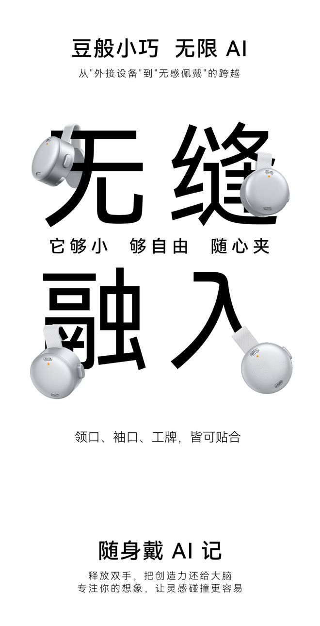 据IT之家了解,该产品单体重量仅 10g,与一颗蚕豆相当,可贴合领口、袖口、工牌,主打功能为随身戴 +AI 记,并支持 AI 可视化实时总结、多语言转写 + 翻译,并可生成图文并茂的“鱼骨图”,可将混乱的讨论变成清晰的结论、代办。