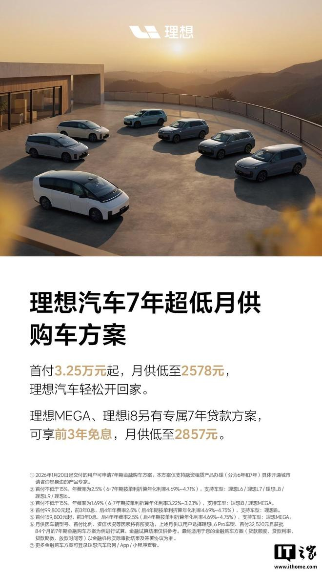 IT之家 1 月 20 日消息,理想汽车官方今日宣布 7 年超低月供购车方案来了。据介绍,2026 年 1 月 20 日起购买理想汽车,可享 7 年超低月供购车方案:首付 3.25 万元起,月供低至 2578 元。
