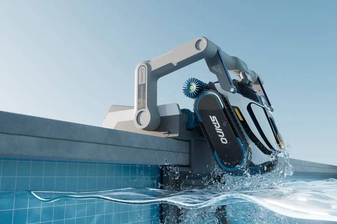 除此之外,Mammotion 还为其设计了一个机械臂基站,在 S1 Pro 快没电时,会自动返回泳池边缘,然后基站会用机械臂将其一把拎起来,并补充电量。