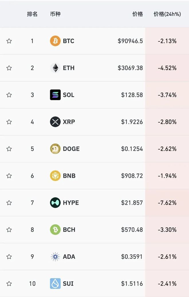 加密货币方面,主要币种全部下跌,比特币价格跌超2%,跌破91000美元,以太坊跌4.52%,狗狗币跌2.62%,近24小时爆仓人数超12.2万人。