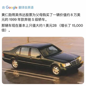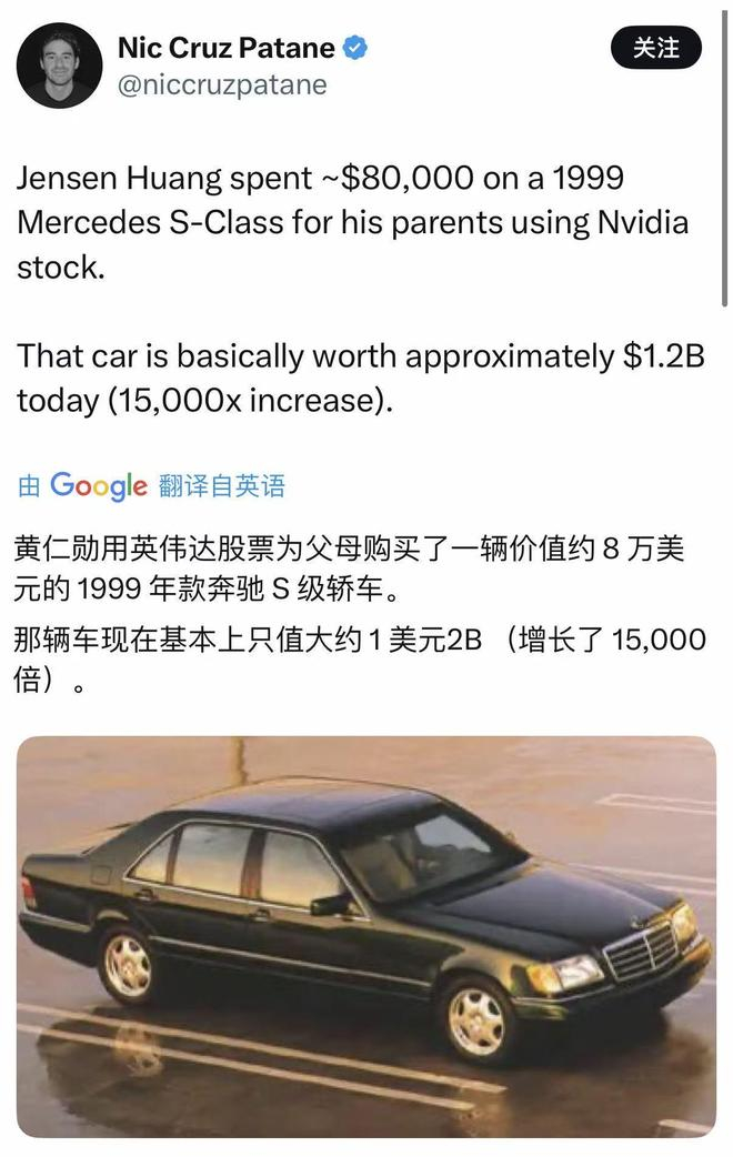 有海外博主指出黄仁勋用英伟达股票为其父母购买 1999 年款奔驰 S 级轿车,价值约为 8 万美元。如果按照英伟达当前市值计算,这辆车价值约为 12 亿美元,增长 15000 倍。