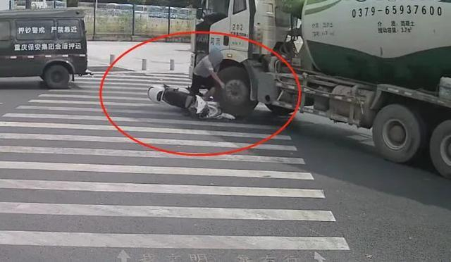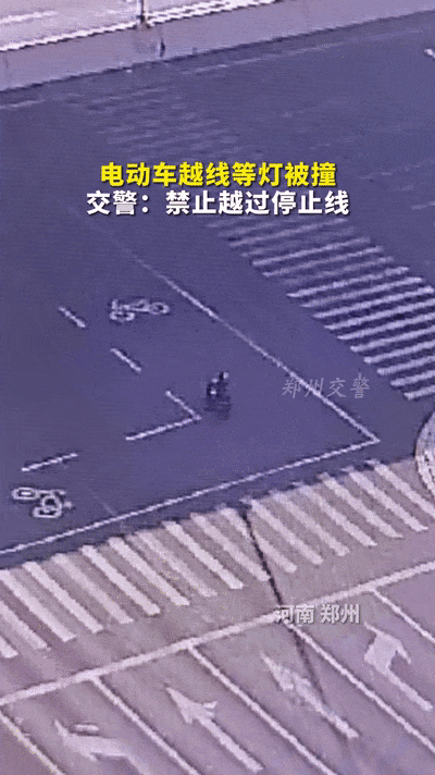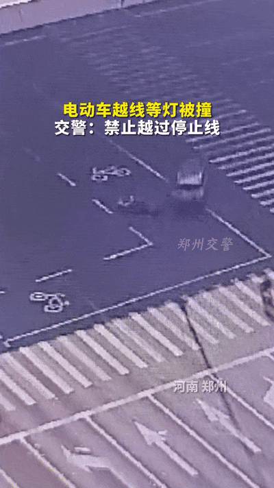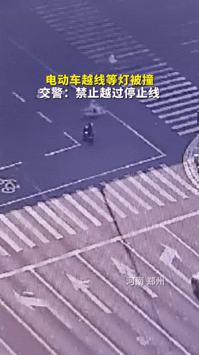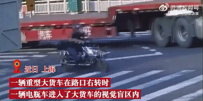 一电动车驾驶人越过停止线等红灯,一直玩手机,车辆也不停往前挪动。此时,一辆水泥罐车左转经过,电动车进入水泥罐车转弯盲区,事故就此发生。